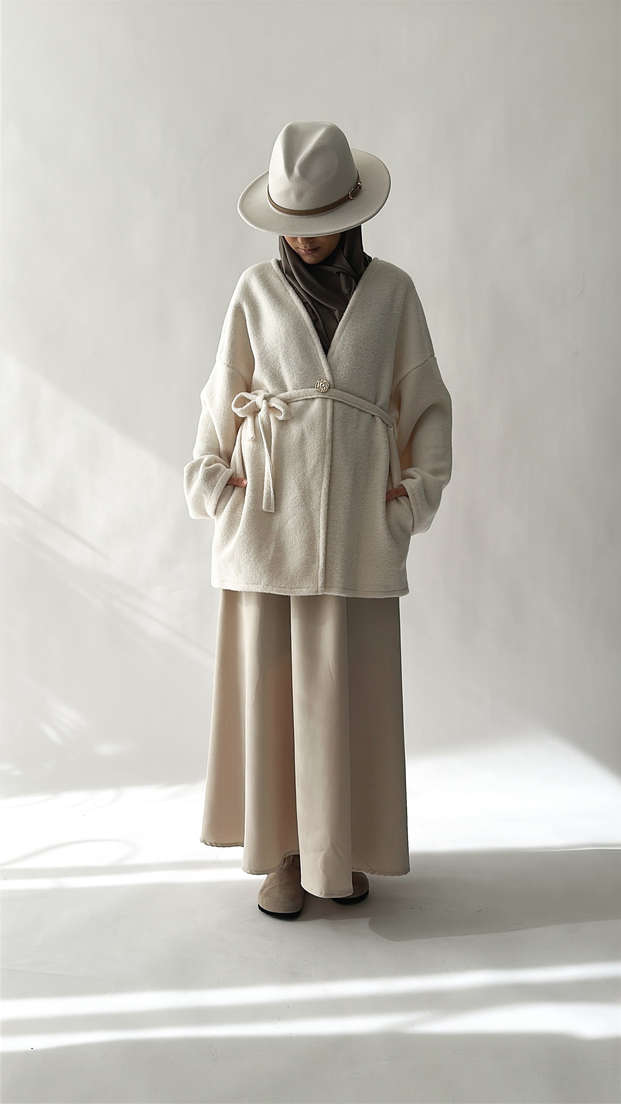 Dieser kurze, elegante Cardigan ist das perfekte Finish für deine Outfits – ob über einem Rock aus unserem Sortiment oder als stilvolle Ergänzung zu einer langen Abaya. Der große Knopf auf der Vorderseite setzt ein charmantes Highlight und macht den Look zu etwas Besonderem.