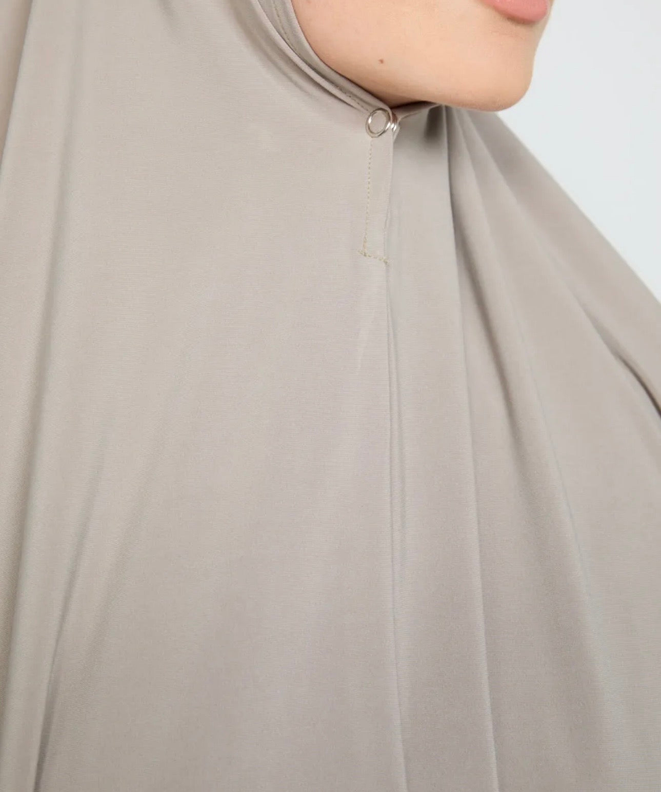 Der Clou an dem Khimar ist der praktische Druckknopf unter dem Kinn. Dadurch lässt er sich einfach und sicher verschließen, ohne zusätzlich gebunden werden zu müssen. Sollte der Khimar dennoch etwas lockerer sitzen, kann er problemlos mit einer Nadel oder einem Pin zusätzlich fixiert werden.