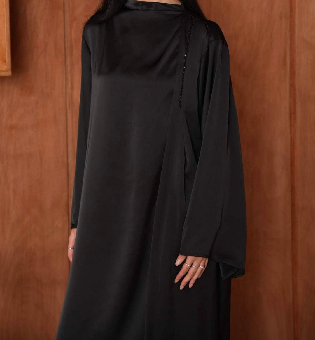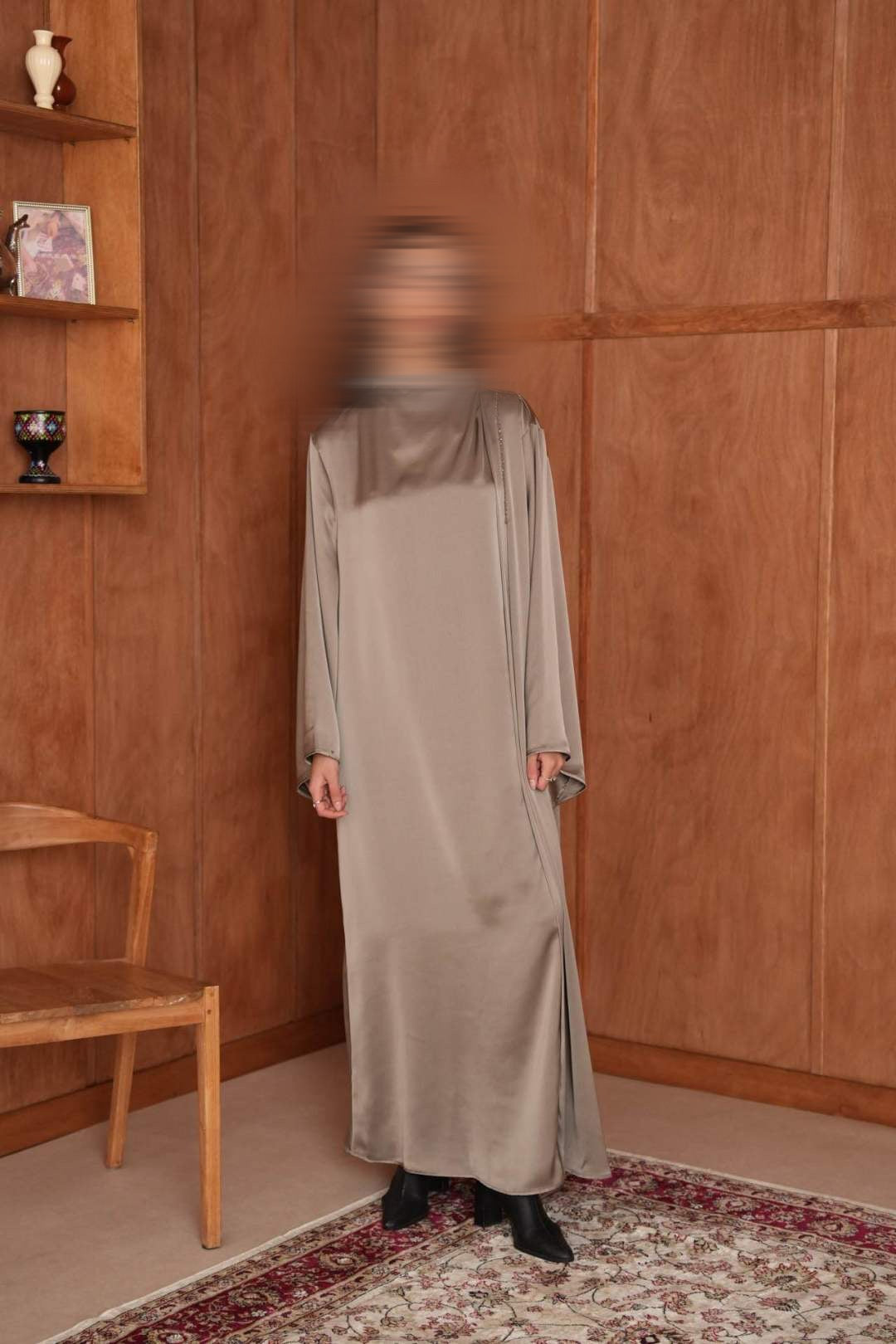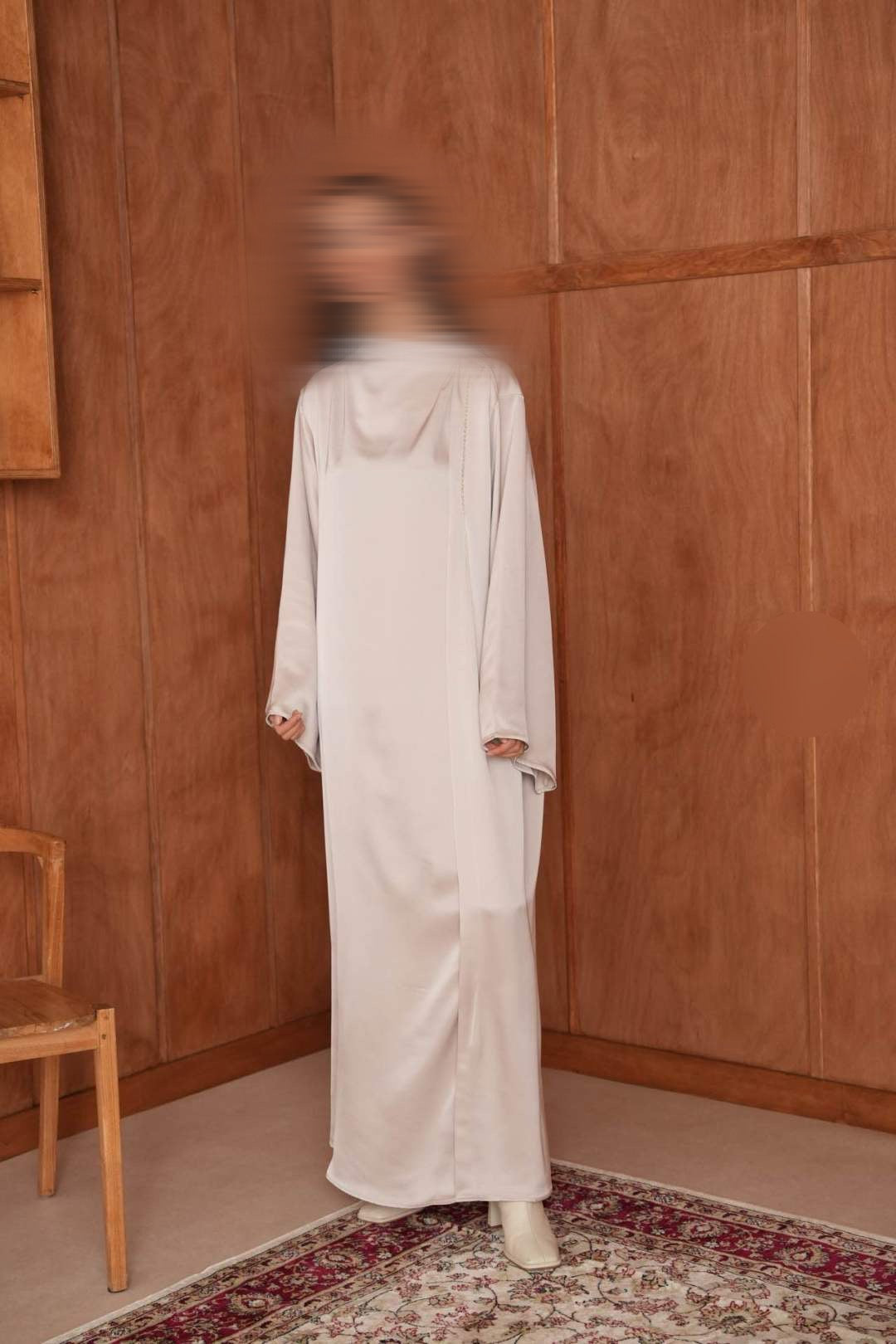 Dieser stilvolle Satin-Abaya strahlt Eleganz und Schlichtheit aus. Das raffinierte Design und der fließende Stoff sorgen für einen eleganten, femininen Look.