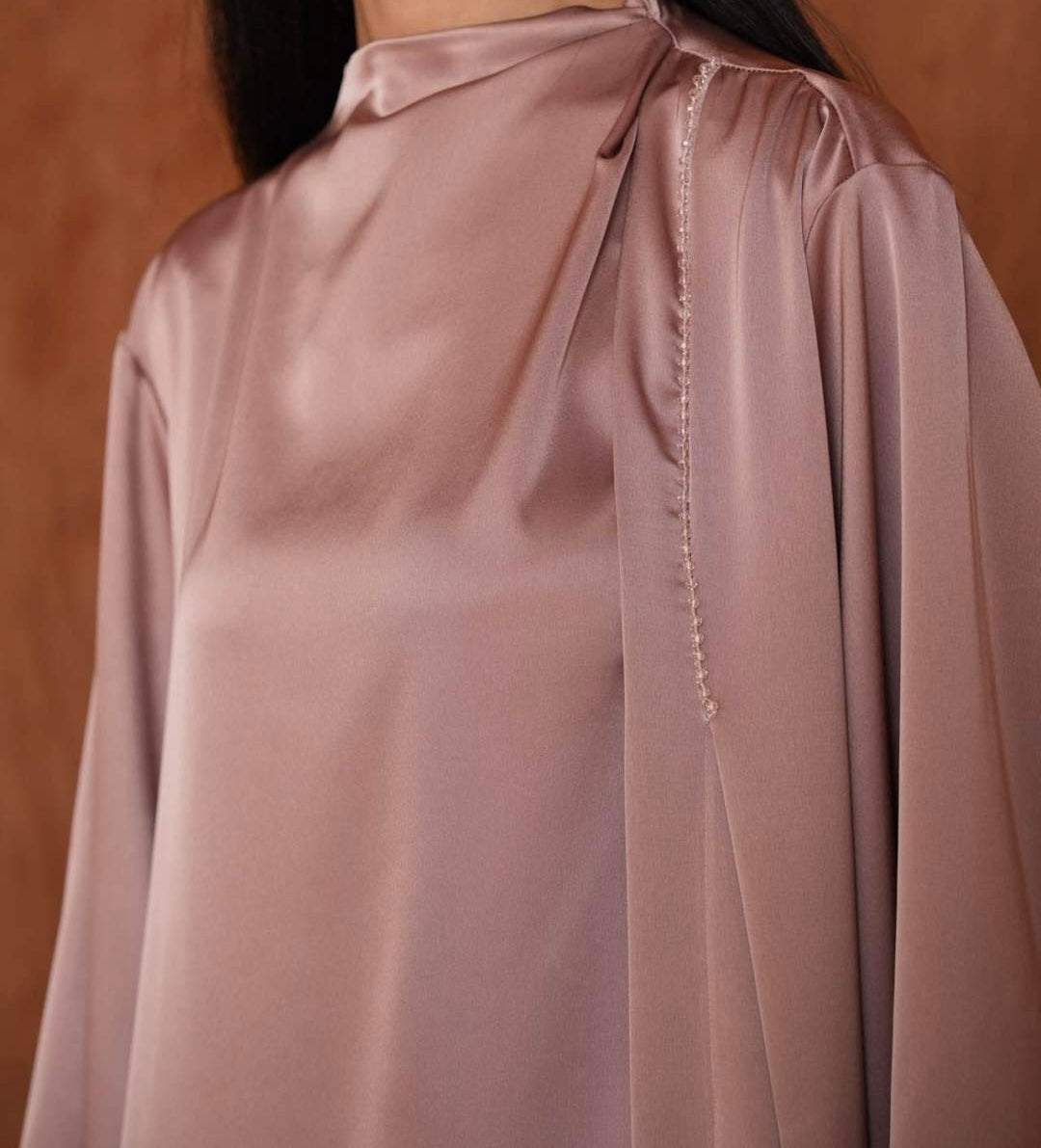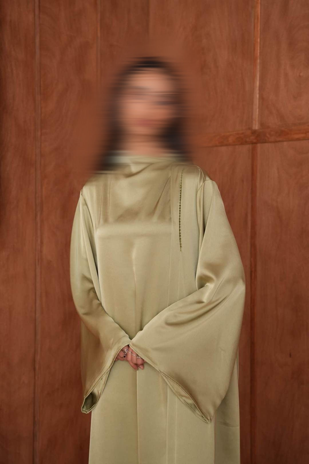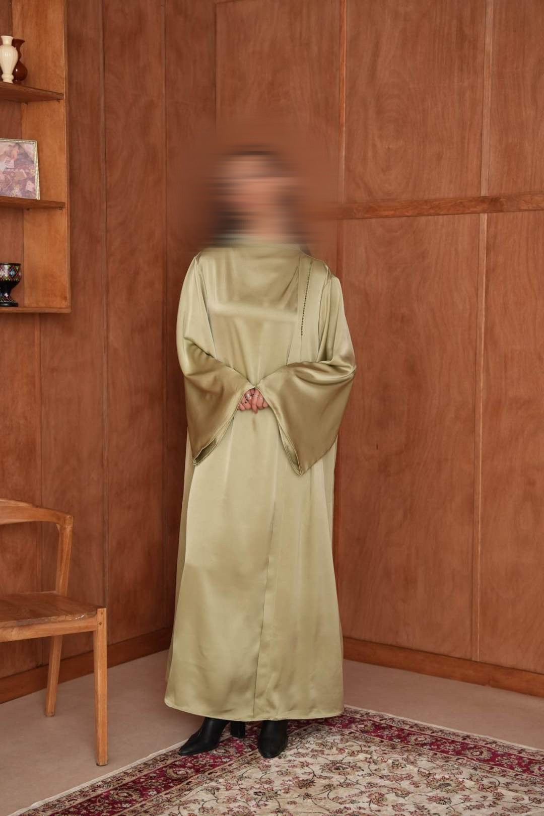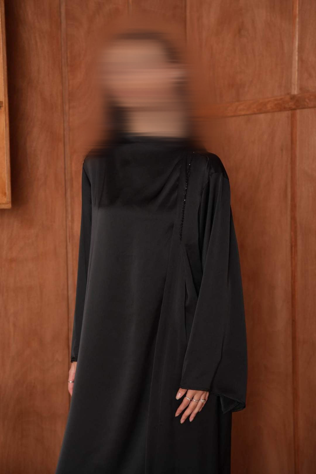 Dieser stilvolle Satin-Abaya strahlt Eleganz und Schlichtheit aus. Das raffinierte Design und der fließende Stoff sorgen für einen eleganten, femininen Look.