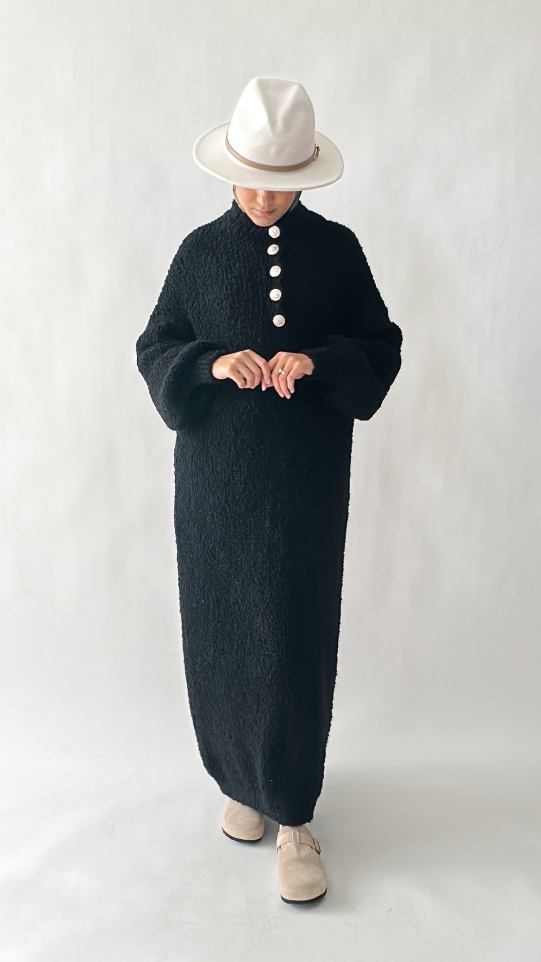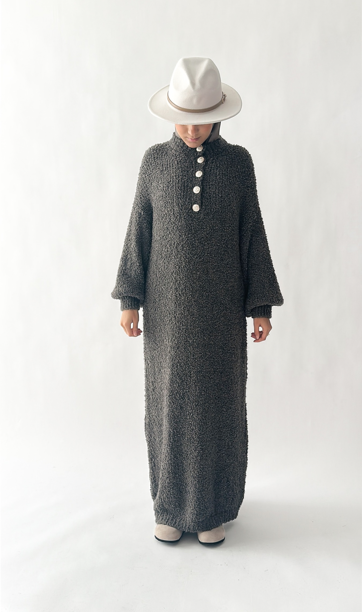 Tauche ein in den ultimativen Wohlfühl-Look mit unserem kuscheligen Maxi-Strickkleid verziert mit eleganten Knöpfen vorne an der Brust. Mit einer Länge von ca. 1,40 m und einem fallenden Winterstoff schmeichelt es jeder Figur – im getragenen Zustand wird das Kleid länger. Das perfekte Kleid für kalte Tage, an denen du nicht auf Stil verzichten möchtest.